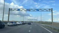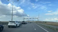 На выезд с полуострова хвост очереди около 9 километра. Со стороны Кубани от заправки Лукойл.