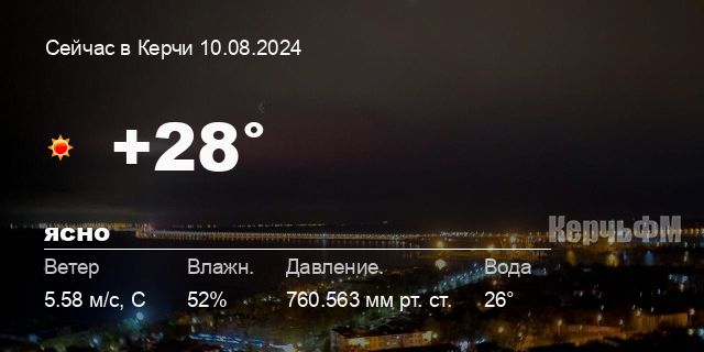 Сегодня днем в Керчи, 10 августа, ожидается ясная погода, температура воздуха от +25.7° до +28.9°С, ветер северный 5.86 м/с, порывы до 4.17 м/с, давление 759.8 мм рт. ст., влажность 49%.