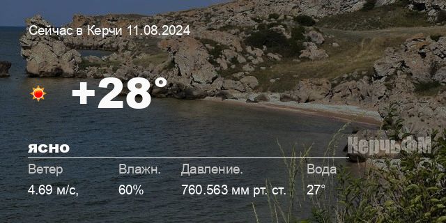 Сегодня днем в Керчи, 11 августа, ожидается ясная погода, температура воздуха от +25.6° до +29.4°С, ветер 3.99 м/с, порывы до 5.19 м/с, давление 759.8 мм рт. ст., влажность 51%.