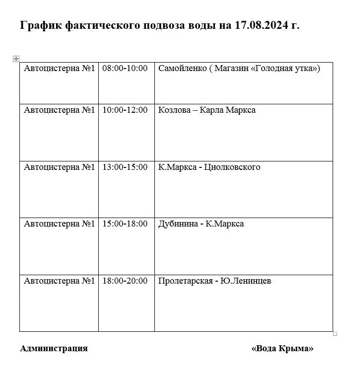 Предприятием будет организован подвоз воды 17 августа в соответствии с прилагаемым графиком
