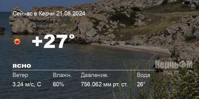 Сегодня днем в Керчи, 21 августа, ожидается ясная погода, температура воздуха от +26° до +28.1°С, ветер северный 2.77 м/с, порывы до 3.24 м/с, давление 755.3 мм рт. ст., влажность 59%.