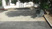 Непосредственно у здания, где не первый год идет ремонт, и работают лишь отдельные кабинеты, по-прежнему лежат старые плиты.