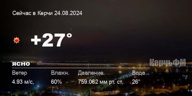 Сегодня днем в Керчи, 24 августа, ожидается ясная погода, температура воздуха от +24.7° до +28.9°С, ветер 4.67 м/с, порывы до 4.95 м/с, давление 759.1 мм рт. ст., влажность 54%.