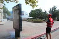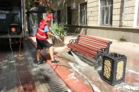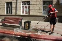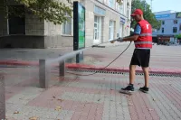 Водой очищают цветочные вазоны, ситилайты и столбы для афиш. Кроме того, убирают пыль с плитки.