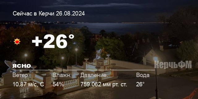 Сегодня днем в Керчи, 26 августа, ожидается ясная погода, температура воздуха от +24.7° до +28.2°С, ветер северный 10.07 м/с, порывы до 10.91 м/с, давление 758.3 мм рт. ст., влажность 48%.