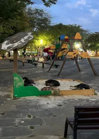 Четыре собаки спят в песочнице для малышей, которая находится на детской площадке в Комсомольском парке, передает КерчьФМ.