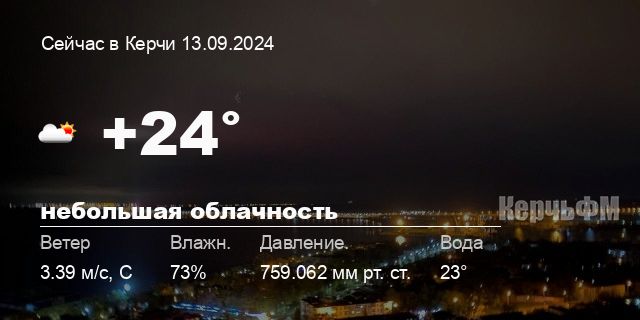 Сегодня днем в Керчи, 13 сентября, ожидается ясная погода, температура воздуха от +21.8° до +24.8°С, ветер северный 4.26 м/с, давление 758.3 мм рт. ст., влажность 67%.
