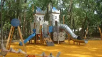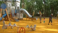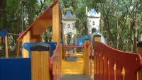 Практически завершены работы на детской площадке, которую украшает дворец с множеством интересных элементов для малышей и детей постарше. И там мы уже застали посетителей.