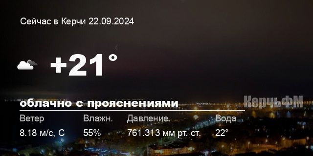 Сегодня днем в Керчи, 22 сентября, ожидается пасмурная погода, температура воздуха от +19.9° до +21.8°С, ветер северный 8.25 м/с, порывы до 9.75 м/с, давление 760.6 мм рт. ст., влажность 55%.