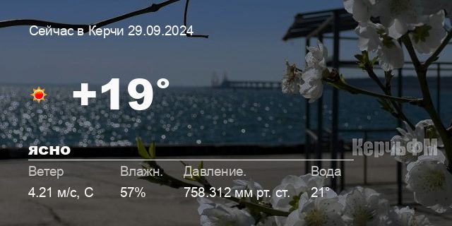 Сегодня днем в Керчи, 29 сентября, ожидается ясная погода, температура воздуха от +18.1° до +21.9°С, ветер северный 3.4 м/с, порывы до 8.66 м/с, давление 756.8 мм рт. ст., влажность 55%.