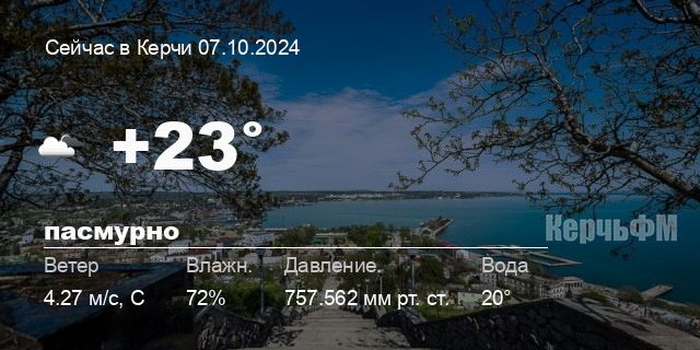 Сегодня днем в Керчи, 07 октября, ожидается небольшой дождь, температура воздуха от +19.3° до +22.5°С, ветер северный 3.41 м/с, порывы до 8.76 м/с, давление 759.1 мм рт. ст., влажность 69%.