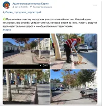 Администрация Керчи часто сообщает об уборках: «Продолжаем очистку городских улиц от опавшей листвы. Каждый день коммунальные службы убирают листья, которые опали за ночь. Работы ведутся вдоль центральных дорог и на общественных территориях».