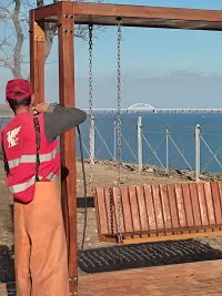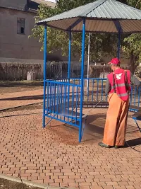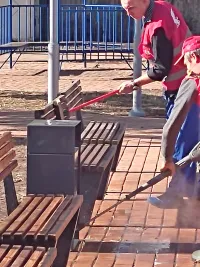 Рабочие подрядной организации ИП "Тубольцев" продолжают работы по очистке лавочек и элементов детских площадок от грязи и пыли.