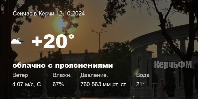 Сегодня днем в Керчи, 12 октября, ожидается переменная облачность, температура воздуха от +19.5° до +21.3°С, ветер северный 3.35 м/с, порывы до 4.07 м/с, давление 759.8 мм рт. ст., влажность 68%.