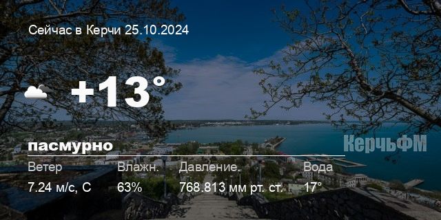 Сегодня днем в Керчи, 25 октября, ожидается пасмурная погода, температура воздуха от +11.8° до +13.2°С, ветер северный 7.6 м/с, порывы до 7.18 м/с, давление 768.1 мм рт. ст., влажность 60%.
