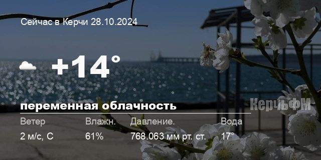 Сегодня днем в Керчи, 28 октября, ожидается малооблачная погода, температура воздуха от +11.8° до +15.6°С, ветер 0.73 м/с, порывы до 3.2 м/с, давление 767.3 мм рт. ст., влажность 59%.