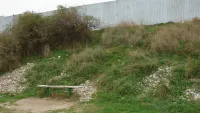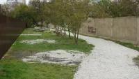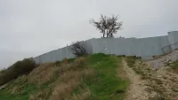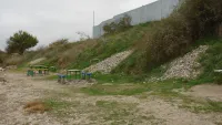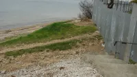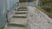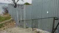 Для прохода местным жителям к морю засыпали гравием слева от забора дорожку, даже заботливо соорудили спуск из шести ступеней, укрепили поручень.