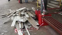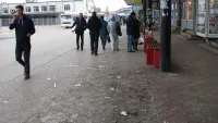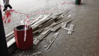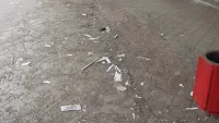 Вся платформа под уже снятой обшивкой усеяна осколками от пластика. Пассажиры общественного транспорта и просто прохожие проходят по ним свободно.