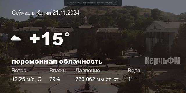 Сегодня днем в Керчи, 21 ноября, ожидается переменная облачность, температура воздуха от +9.2° до +15.2°С, ветер северный 13.08 м/с, порывы до 9.22 м/с, давление 750.8 мм рт. ст., влажность 73%.
