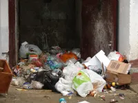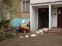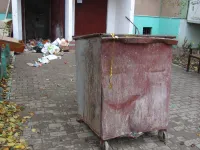 Дверь мусорника - настежь, пустой контейнер - на тротуаре, мусор сыпется через мусоропровод на асфальт.
