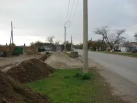 Будущий тротуар уже местами обозначен бордюрным камнем и уложен гравием. Асфальтировка начата от храма Дмитрия Донского.