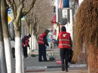 Дворники собирают бытовой мусор, вычищают урны, подметают тротуары.