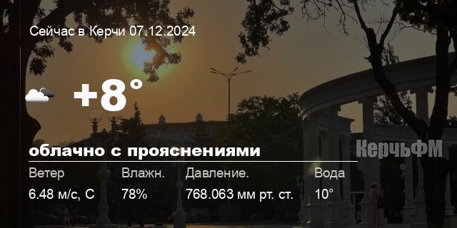Сегодня днем в Керчи, 07 декабря, ожидается малооблачная погода, температура воздуха от +7° до +9.1°С, ветер северный 7.12 м/с, порывы до 9.11 м/с, давление 767.3 мм рт. ст., влажность 70%.