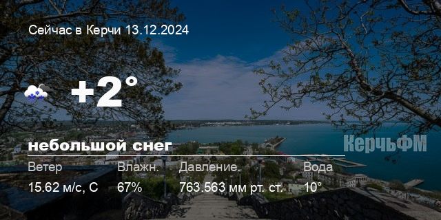 Сегодня днем в Керчи, 13 декабря, ожидается малооблачная погода, температура воздуха от +0.4° до +3.1°С, ветер северный 14.95 м/с, порывы до 15.62 м/с, давление 766.6 мм рт. ст., влажность 57%.