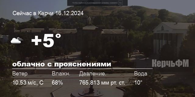 Сегодня днем в Керчи, 16 декабря, ожидается малооблачная погода, температура воздуха от +4.6° до +7.5°С, ветер северный 9.85 м/с, порывы до 11.93 м/с, давление 765.8 мм рт. ст., влажность 60%.