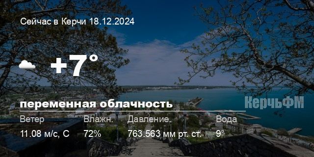 Сегодня днем в Керчи, 18 декабря, ожидается переменная облачность, температура воздуха от +6° до +9.5°С, ветер северный 11.18 м/с, порывы до 12.24 м/с, давление 764.3 мм рт. ст., влажность 71%.