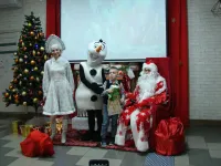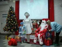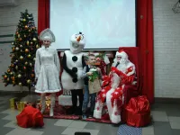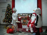 Снеговик, Снегурочка и Дед Мороз, который лично каждому вручил по два подарка, один из которых, конечно же, был сладким.