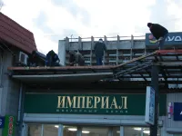 Рабочие практически завершают сварочные работы и укладку профнастила.