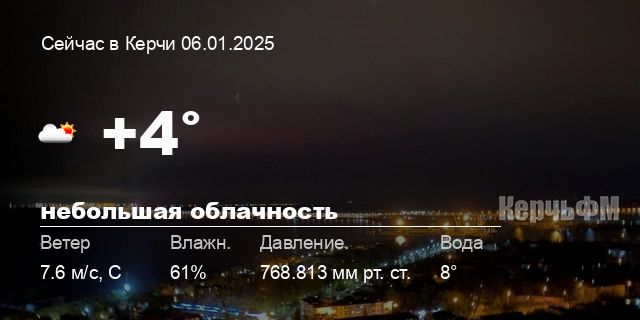 Сегодня днем в Керчи, 06 января, ожидается небольшая облачность, температура воздуха от +1° до +7.8°С, ветер северный 8.32 м/с, порывы до 9.76 м/с, давление 768.1 мм рт. ст., влажность 68%.