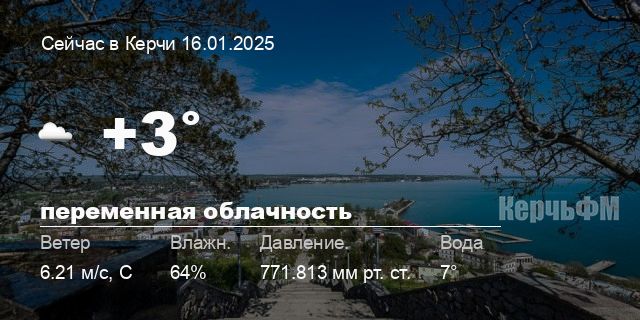 Сегодня днем в Керчи, 16 января, ожидается пасмурная погода, температура воздуха от +2.3° до +3.6°С, ветер северный 6.42 м/с, давление 773.3 мм рт. ст., влажность 59%.