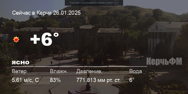 Сегодня днем в Керчи, 26 января, ожидается ясная погода, температура воздуха от +5.1° до +7°С, ветер северный 4.87 м/с, порывы до 5.61 м/с, давление 771.1 мм рт. ст., влажность 78%.