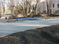 На газоне видны следы тяжелой техники. Рядом ведутся работы по укладке труб нового магистрального водовода.