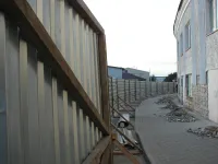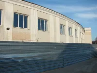 С правой части фасада здания центрального входа снимают облицовку. Место работ оградили забором.
