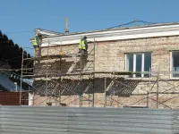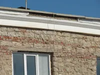 Сегодня рабочие подрядной организации трудились над восстановлением внешнего вида парапета кровли, которая выполняет не только эстетическую функцию, но и практическую.