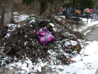 Рядом с храмом есть мусорный контейнер "лодочка", но он практически пустой... Территория кладбища большая, не каждый понесет мусор сюда, особенно, если могила находится в глубине кладбища или на его окраине.