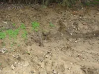 Ручей берет свое начало на газоне, рядом наблюдаются недавние земляные работы.