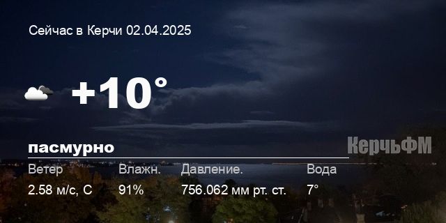 Сегодня днем в Керчи, 02 апреля, ожидается пасмурная погода, температура воздуха от +9.1° до +11.4°С, ветер северный 1.71 м/с, порывы до 6.81 м/с, давление 754.6 мм рт. ст., влажность 82%.