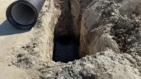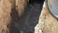 На дороге лежат трубы и вырыта траншея. А вот в ней распиленная труба, из которой напором вытекают нечистоты в грунт. Водоканал осознано все так бросил и загрязняет грунт? На улице стоит стойкий неприятный запах.