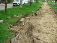 На центральной аллее демонтированы бордюры и тротуарная плитка практически до середины дома Кирова, 99, со стороны храма Андрея Первозванного.