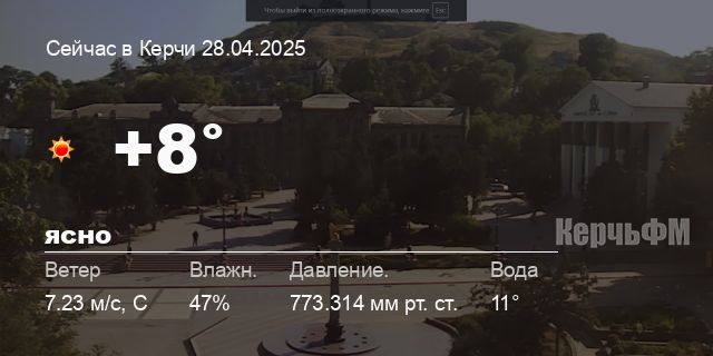 Сегодня днем в Керчи, 28 апреля, ожидается ясная погода, температура воздуха от +7.5° до +9.9°С, ветер северный 7.08 м/с, порывы до 8.51 м/с, давление 773.3 мм рт. ст., влажность 45%.