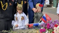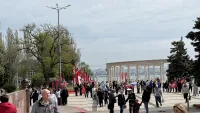 Керчане пришли с флагами и портретами своих погибших родственников. На площади Ленина играет патриотическая музыка. Горожане фотографируются у новых инсталляций.