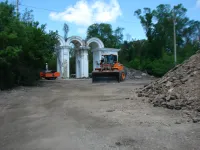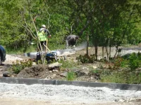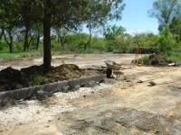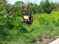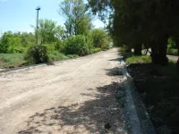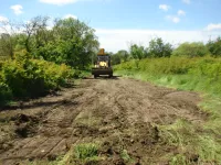 Помимо всего, через заросшую территорию бульдозер прокладывает дорожки, где будут обустроены боковые подходные тротуары, ведущие к центру парка.