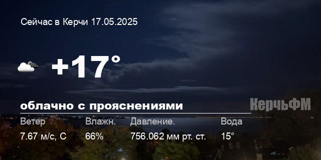 Сегодня днем в Керчи, 17 мая, ожидается малооблачная погода, температура воздуха от +15.2° до +18.6°С, ветер северный 7.16 м/с, порывы до 7.67 м/с, давление 754.6 мм рт. ст., влажность 76%.