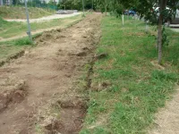 Работы здесь были начаты в марте с обрезки деревьев и демонтажа тротуарной плитки и старых бордюров.