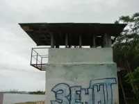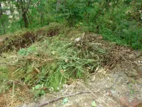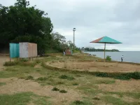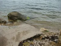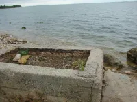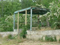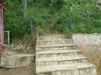 Из трех спусков целым остался лишь один, размытый берег, камни, разрушенная беседка, допотопные раздевалки, поросль внизу и заросли сверху. Полное отсутствие песка.