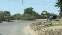 Край дороги оградили сигнальной лентой, чтобы в ямы случайно не съехали автомобили.